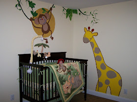 In any case, I knew I could never have a boring nursery! From the minute I saw the bedding ensemble, I knew I wanted there to be big palm trees, a swinging monkey, a giraffe looking over the crib and an elephant on the walls. It's amazing what you can do with a little imagination and a projector! Mom helped me get it all started and Jorge and I finished the majority of all the work. It was so much fun. I love creating memories for our little one before we even get her!